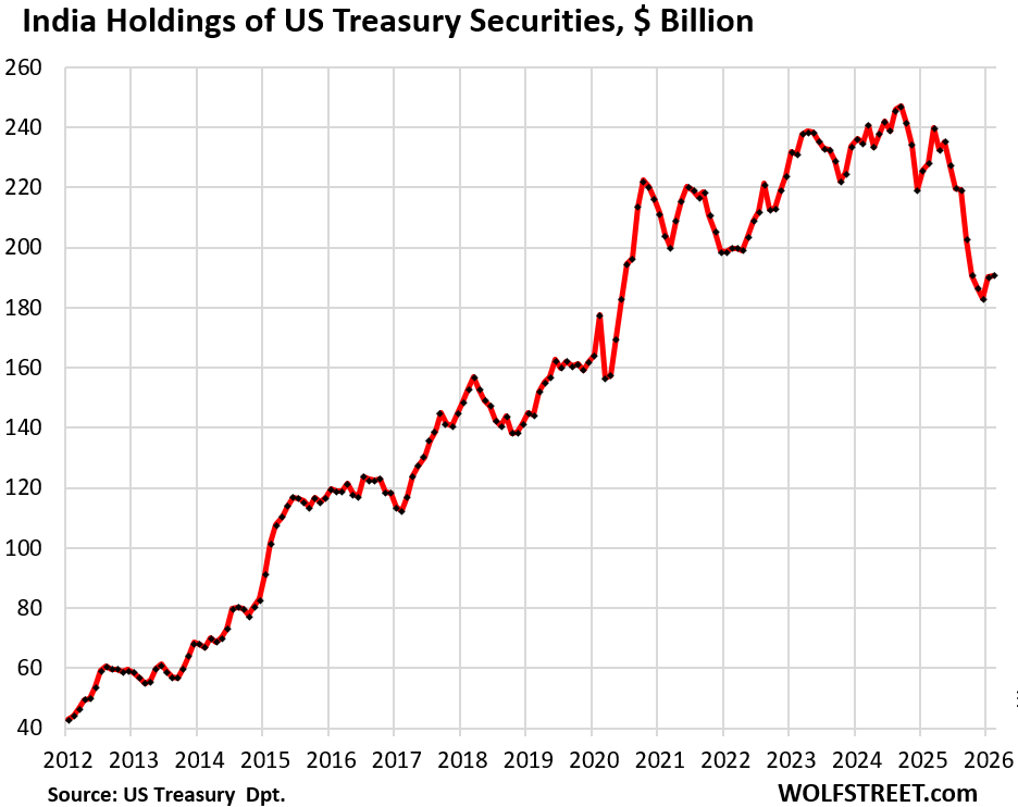 India’s holdings have risen over the past two months, to $191 billion, after dropping sharply from the peak in 2024 ($247 billion).