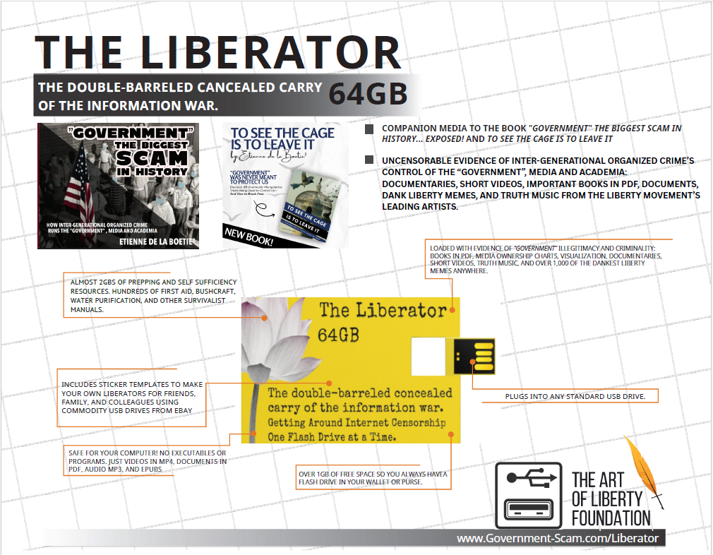 The Liberator– A credit card-sized flash drive (and FREE Dropboxes) full of liberty resources that expose the control system, make evidence of “government” illegitimacy and criminality uncensorable and provide the healthy alternatives of voluntaryism, freedom, love, tolerance, Agorism, and counter-economics. In an age of algorithmic censorship on the DARPA Internet and evidence of the organized crime government’s illegitimacy and criminality disappearing off the Net, we are making uncensorable and easy-to-copy/share with your friends, and colleagues.