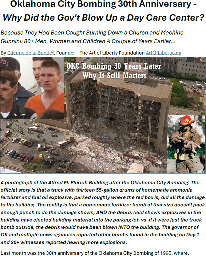 Century of Enslavement (Federal Reserve Scam) by James Corbett, Waco – A New Revelation (FBI and Delta Force Murder 80+ Men, Women and Children in a Church), A Noble Lie (Gov’t Behind OKC Bombing), 9-11 Explosive Evidence – Experts Speak Out