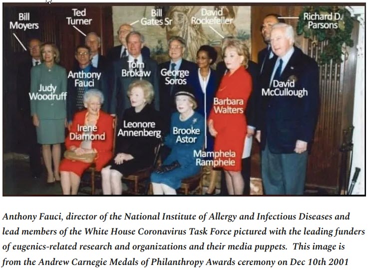 A short summary of my developing thesis is that some of the greatest criminal fortunes in history, especially the Rockefellers and Carnegies, were left to support eugenics goals. These fortunes have allowed an inter-generational organized crime syndicate to rob and control the population using “Government”. Through their control of the “Government”, Anthony Fauci was installed in the NIH, NIAID and CDC to further eugenics and population reduction through mass vaccination. Bill Gates, George Soros, Warren Buffett, Peter Ackman, Blackrock, and Vanguard have been installed and empowered to manage these fortunes and scoop up the world using the scam of fractional reserve banking to buy up the most important companies and control the most important non-profits, foundations and NGOs.