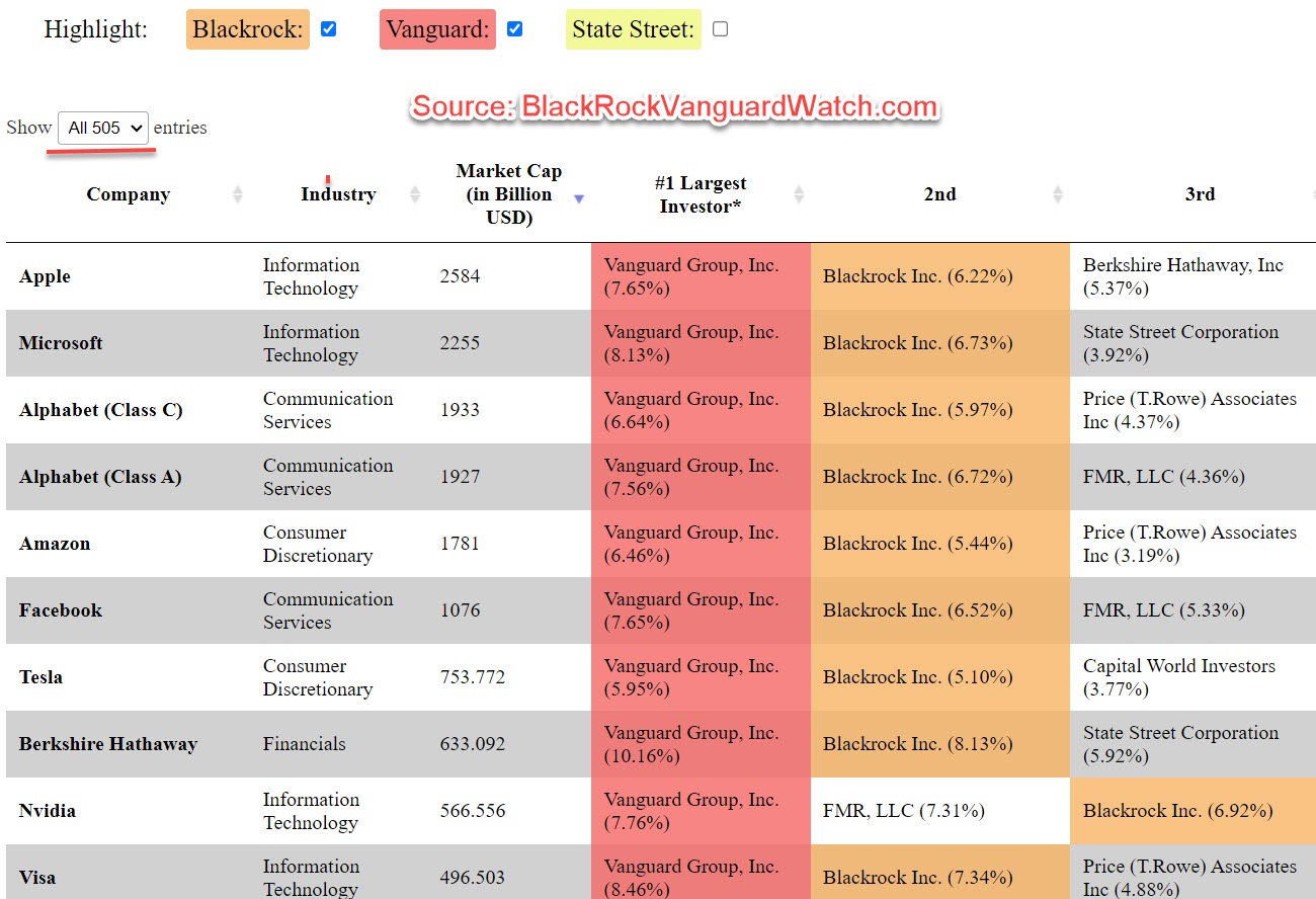 Blackrock and/or Vanguard are among the three largest institutional investors for 505 out of 505 of the S&P 500. (100%) One or the other is the single largest institutional investor in 422 of these. (84%) Source: BlackRockVanguardWatch.com