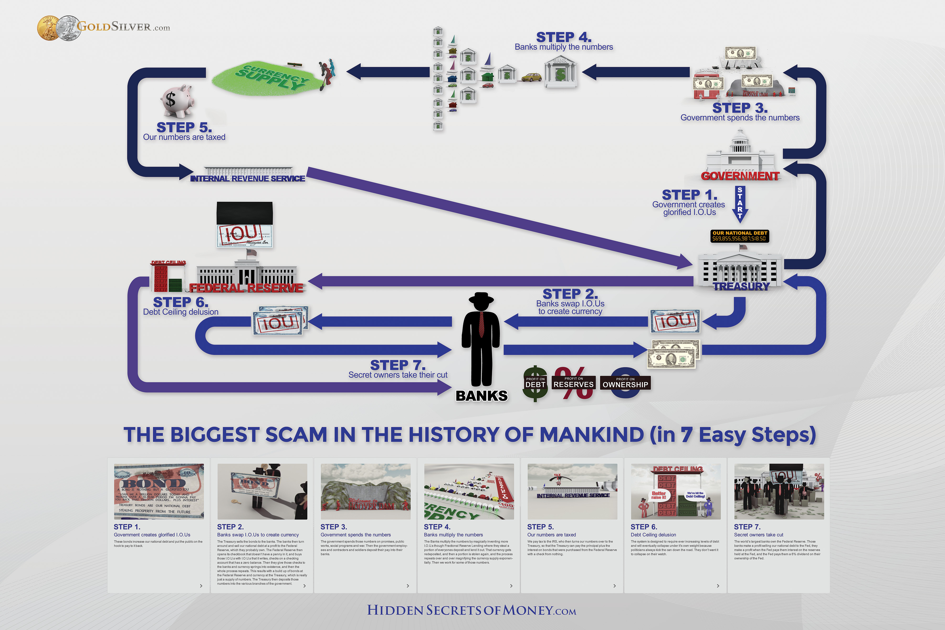 In 1913 organized crime banking interests lobbied and bribed Congress to pass the Federal Reserve Act, which created the private Federal Reserve (FED) to back-stop and “legalize” the ability of private banks to create money out of thin air and lend it at interest. The process is called fractional reserve banking, and the basics of the swindle is that when you go to the bank to get a mortgage, the bank is not lending you another depositor’s money.
