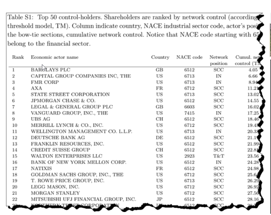 The list above comes from a 2011 study called The Network of Global Corporate Control, which analyzed 37 million global companies and 43,060 transnational corporations and built a model of who owns and controls what and discovered that just 147 firms, primarily banks and financial institutions, control 40% of global wealth.