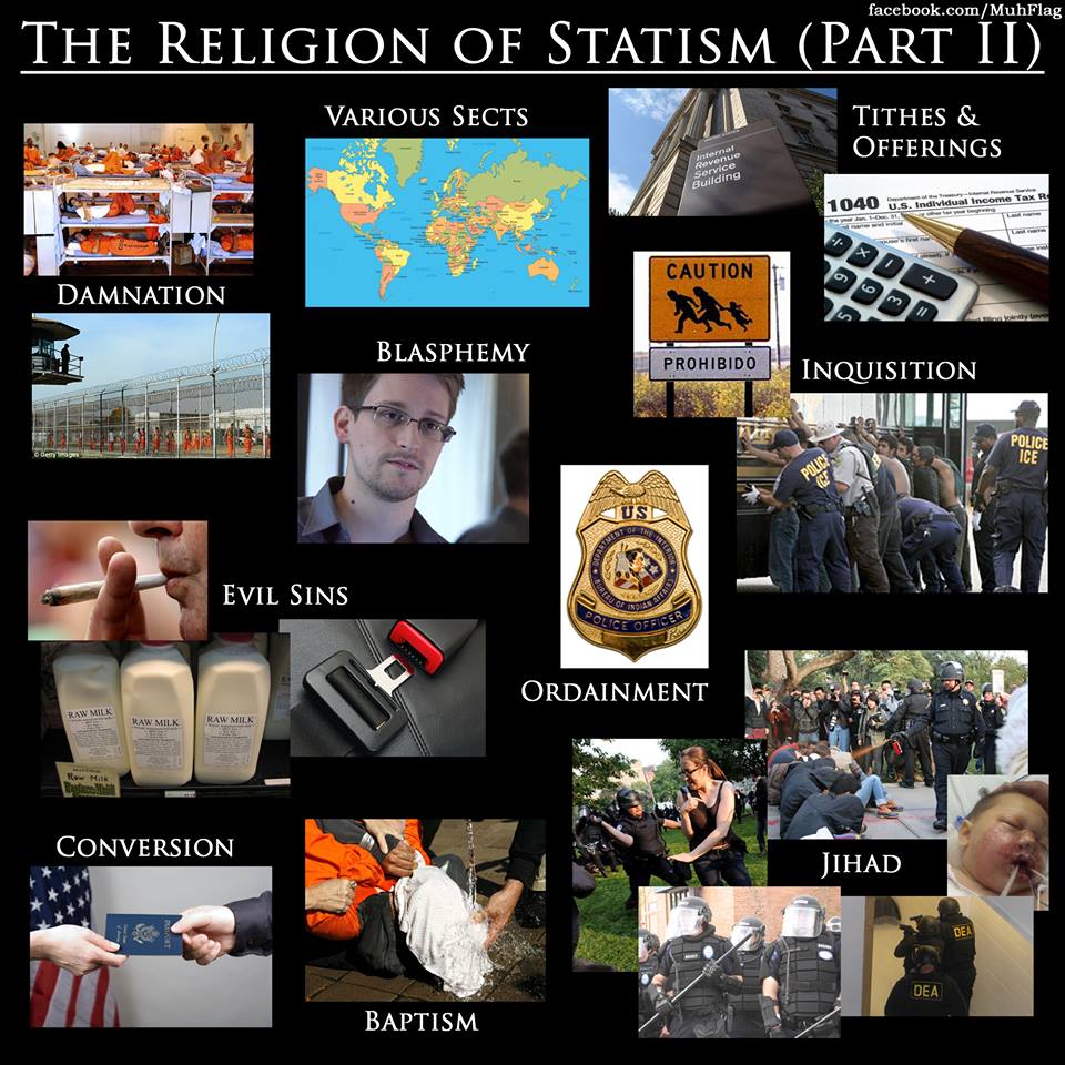 Statism is a pseudo-religious belief, I.E., “Government” is not a physical entity that can be touched. It is a supernatural entity that promises to make the world a better place for true believers who have accepted the belief system into their worldview. The multi-generational organized crime system ruling the planet from behind the scenes uses the same techniques that religions and cults use on their followers to brainwash the masses into accepting a ruling class.