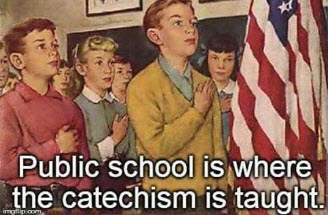 These techniques include Religious symbolism in the form of the flag, the Presidency (Pope), “holy documents” in the Constitution and Declaration of Independence, mandatory “church” schools, common prayer where children are required to recite the pledge of allegiance every day at school and scouting meetings,