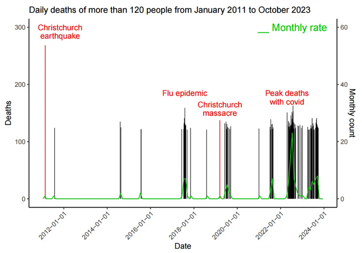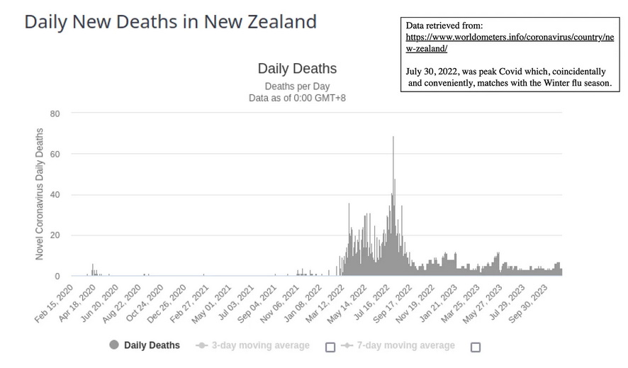 The record-level data shows what can only be termed a massacre of New Zealanders starting immediately after the vaccines were rolled out vs. negligible death rates during “The Covid” and before the injection campaign began.