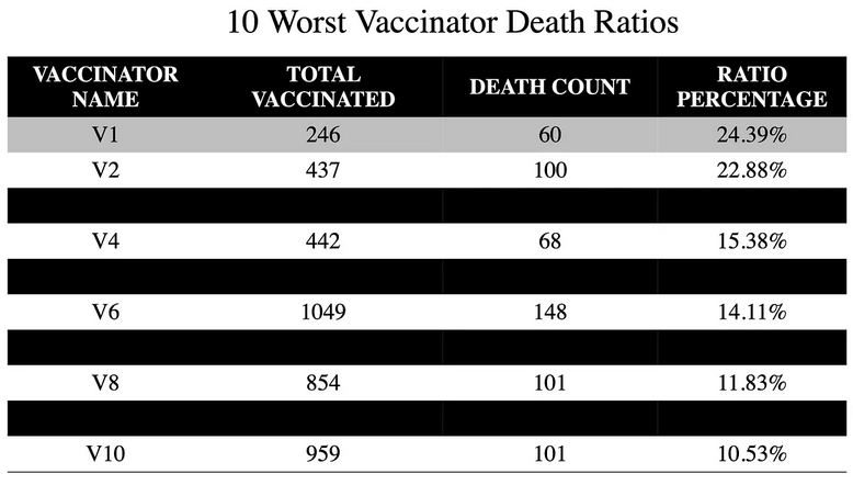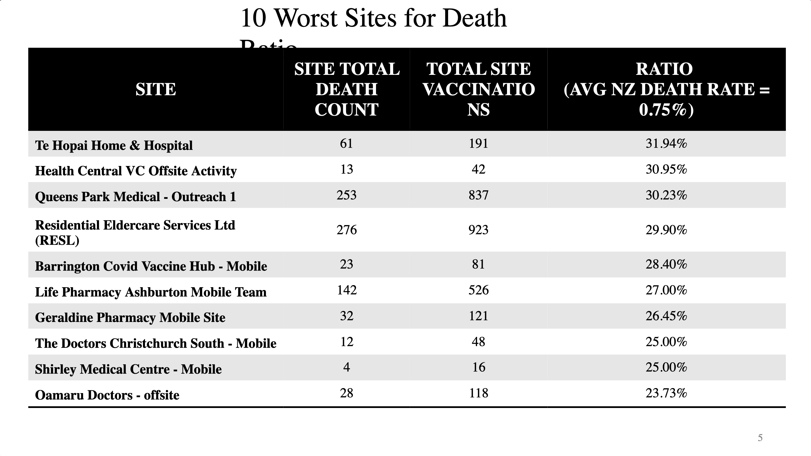 Using the NZ government’s own patient record data, he shows that at least 10 vaccination sites had mortality rates of over 20% dead after vaccination with the top three sites reporting a mortality rate of over 30%.