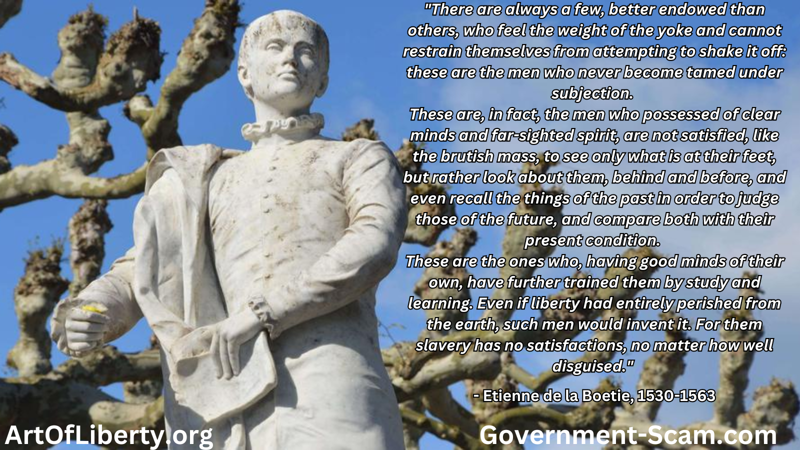 Etienne de la Boetie2 is the founder of the Art of Liberty Foundation and the editor of the Art of Liberty Daily News on Substack and Five Meme Friday, which delivers hard-hitting voluntaryist memes and the best of the alternative media. He is an internationally recognized expert and speaker on voluntaryism and government illegitimacy, criminality and corruption. His original writings and research can be found at ArtOfLiberty.org and ArtOfLiberty.Substack.com