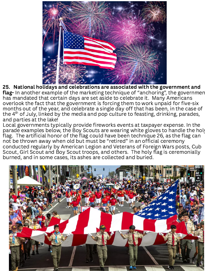The 25th Technique I break down in the book is: National Holidays and Celebrations are Associated with the “Government” and Flag - I am replicating the entire page from the book below, but the executive summary is the “government” that is tax farming the population for 1/2 their income is giving an infinitesimal portion back in fireworks, parades, and a day off while forcing the population to work without pay for 5-6 months of the year when you include the overt taxes, covert taxes, and inflation, is engaged in a form of marketing known as “Anchoring” that I spell out in the book.
