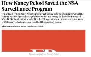 In 2013, there was a bill to rein in the NSA’s domestic spying powers by imposing serious limits on how such powers can be exercised when aimed at American citizens. But Obama was an enthusiastic supporter — and user — of the NSA’s domestic spying system and he instructed then-Speaker of the House Nancy Pelosi to conjure enough Democratic House votes to kill the bill. The same tactics are being used today.