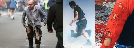 Left: James “Bim” Costello, Middle: Kyle Larrow, Right: Close-up of Nicole Brannock Gross’s shirt. All displaying impossible prop clothing where allegedly pipe bomb shrapnel/blast shredded the fabric of the clothing but did no damage to the skin underneath. Costello’s shirt shows impossible clean vertical cuts.