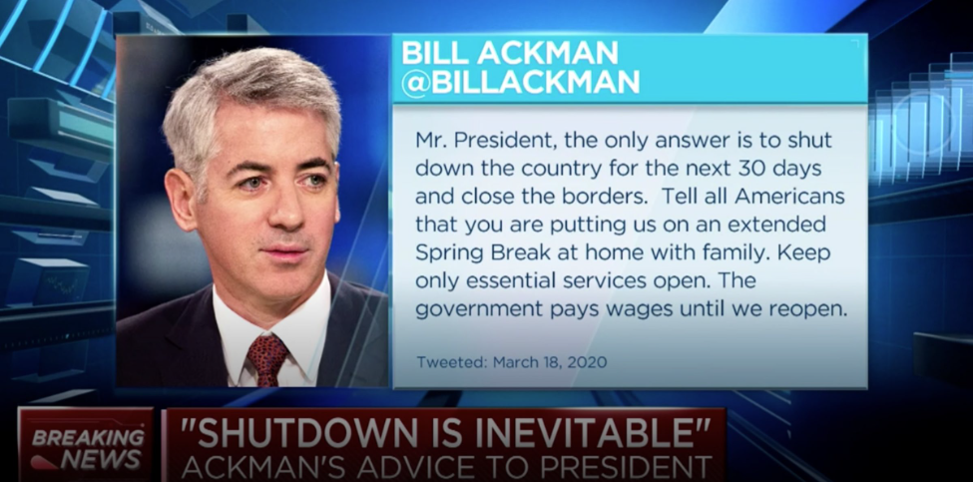 [cxii] CNBC Audio Clip: Billionaire investor Bill Ackman: I went into lockdown almost a month ago to save my father from coronavirus, Bill Ackman, Pershing Square Capital CEO, calls into ‘Halftime Report’ to discuss why it is urgent that people go home for at least 30 days, Wed, Mar 18 2020 - https://www.cnbc.com/video/2020/03/18/billionaire-investor-bill-ackman-i-went-into-lockdown-almost-a-month-ago-to-save-my-father-from-coronavirus.html