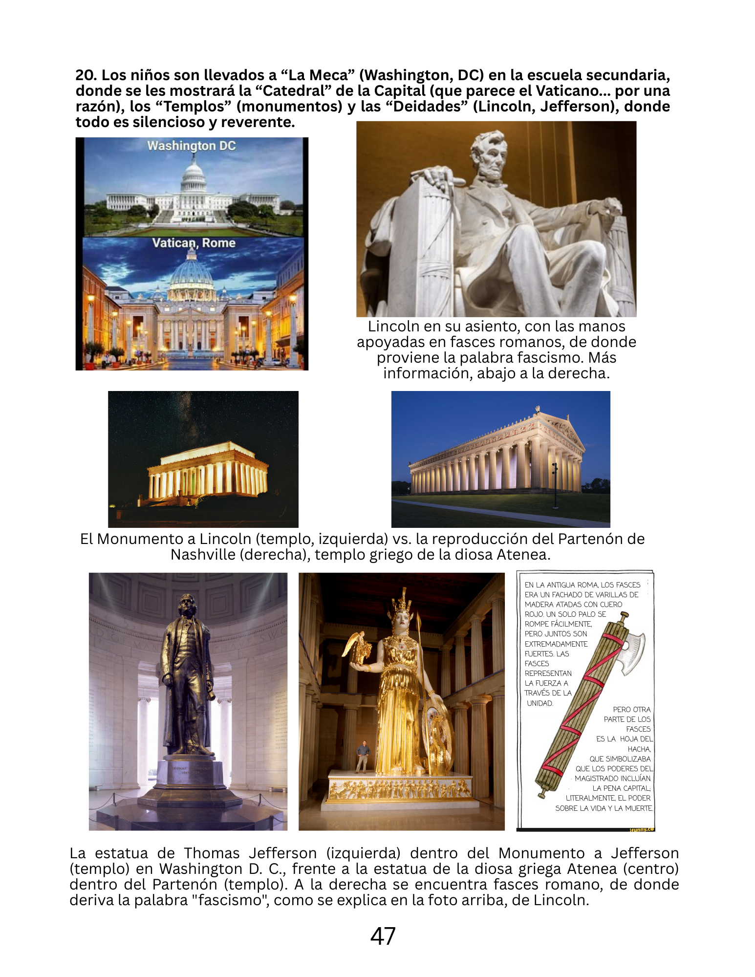 Esta es una página de Ver la jaula es salir de ella que expone la técnica #20, donde se lleva a niños de secundaria a la “Meca” (Washington, D.C.), se les conduce a la “Catedral” del Capitolio (¡que se parece al Vaticano... por una razón!), y a los “Templos” (Monumentos) donde se les muestran las “Deidades” (Lincoln, Washington), en un entorno que se mantiene artificialmente silencioso y reverente.