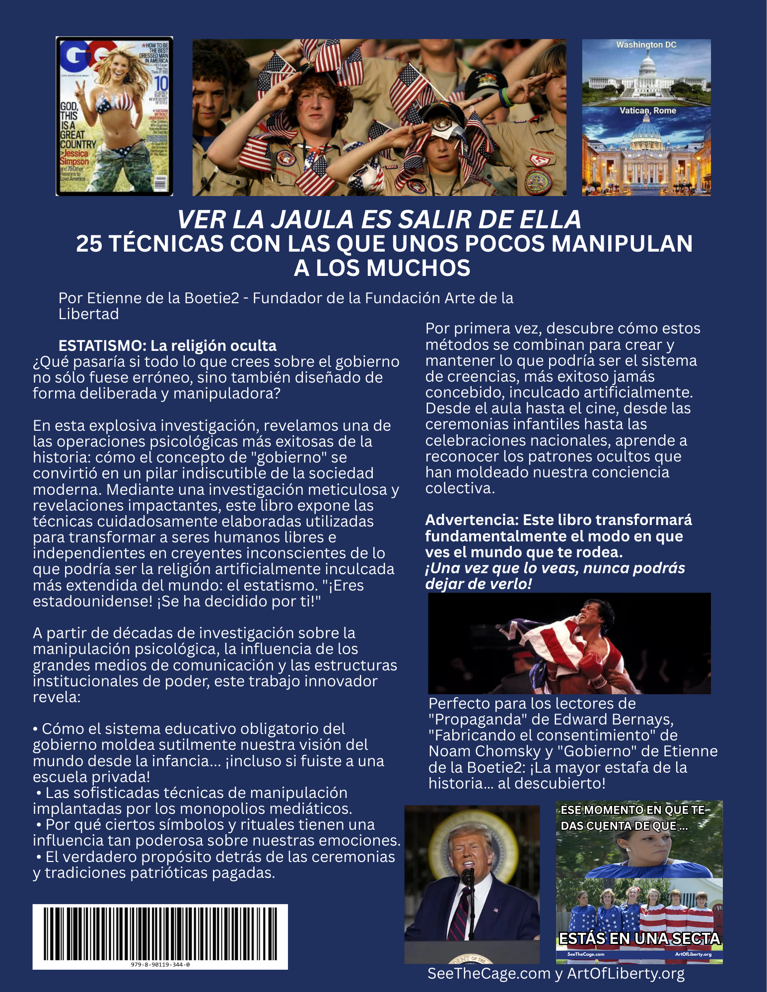 La Fundación Arte de la Libertad, una fundación de políticas públicas voluntaristas, anuncia un nuevo libro: Ver la jaula es abandonarla: 25 técnicas con las que unos pocos manipulan a los muchos. El libro más reciente del fundador de la fundación, Etienne de la Boetie2, expone que el gobierno y Hollywood han estado ejecutando una operación psicológica multimillonaria y multigeneracional sobre la población para adoctrinarla y que acepte a una clase dominante, impuestos confiscatorios y una moneda de reserva fraccionaria inflacionaria emitida por bancos privados.
