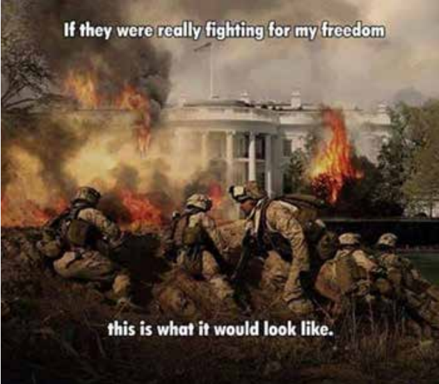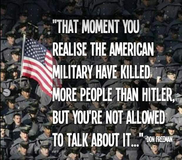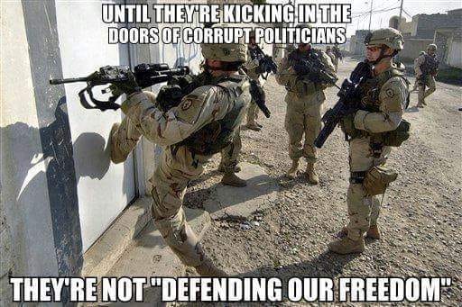 Tough love for the military: You are not protecting the United States. You are participating in foreign wars and proxy wars being waged by an inter-generational organized crime system tricking you with false flag attacks (9-11) and wars based on lies and manufactured intelligence.