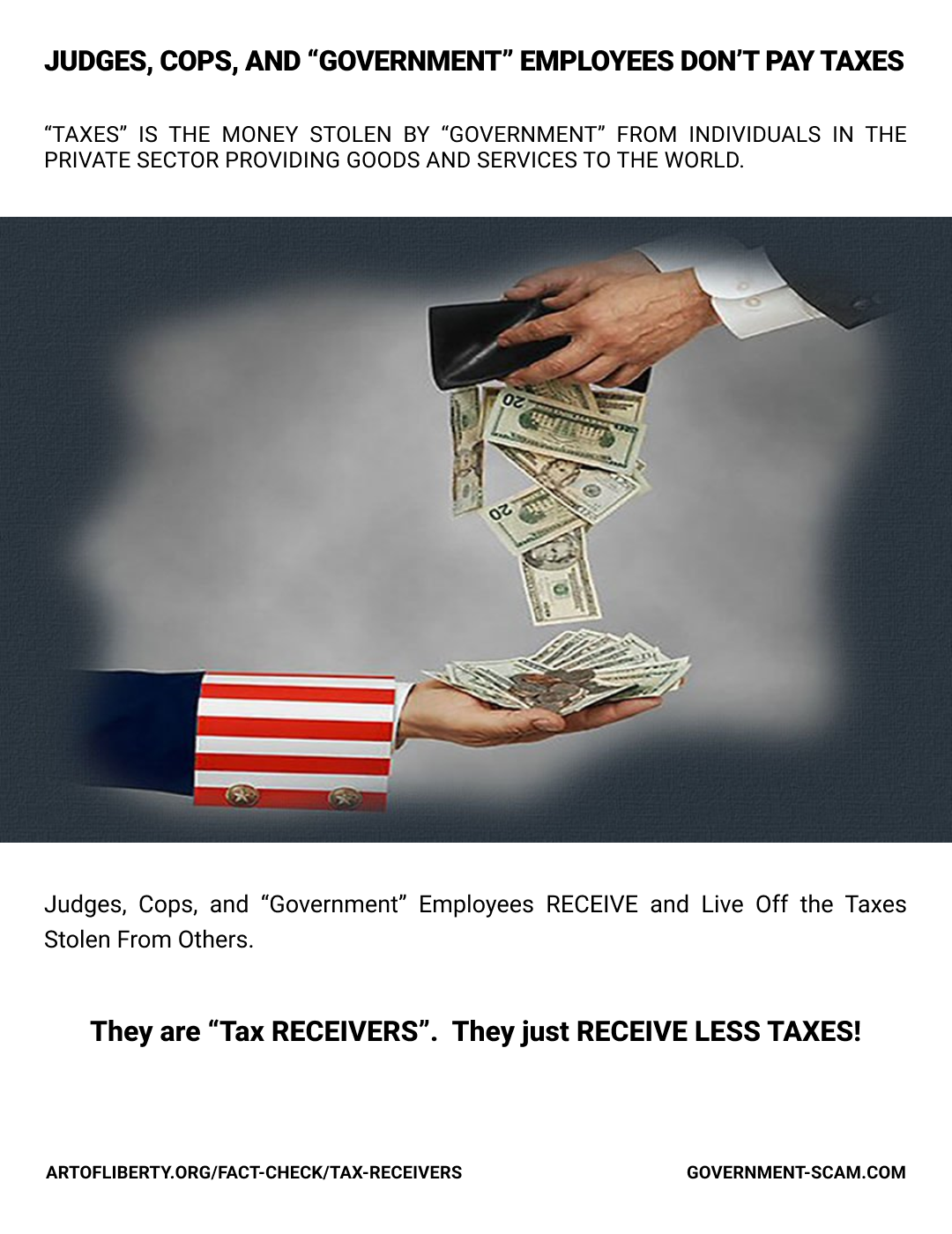 Understand That You Are Living off Money Extorted from Your Friends, Family and Neighbors at the Point of a Gun, and While They Are Being Forced to Pay Taxes, You Are NOT Paying Taxes - That, unfortunately, is the “tough love” stone-cold truth of your situation. Taxes are what is extorted from the population to pay your salary. You don’t “pay taxes,” you just receive less taxes. You are not a tax-payer… You are a tax-receiver.