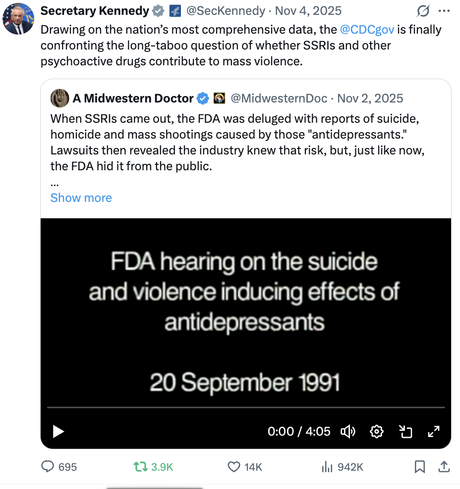 Note: initially, there were many news reports which disclosed school shooters were on SSRIs, but once this was noticed, the media largely stopped reporting what medications shooters were on. I recently learned through a CDC employee that the CDC continued to privately track this and found the link persisted, but did not disclose it due to the political ramifications of doing so—hence illustrating why Kennedy’s recent statement is so extraordinary.