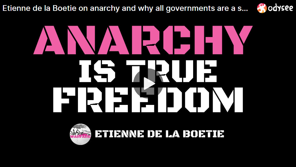 Etienne de la Boetie2 (yes, with a squared sign and, no, it isn’t his real name) previously chatted to me about why all governments are illegitimate authorities and, basically, why anarchy is not a bad word. Establishment propaganda has done a great job of duping a lot of people into believing that being governed by a self-imposed authority with a monopoly on violence, is equal to freedom.
