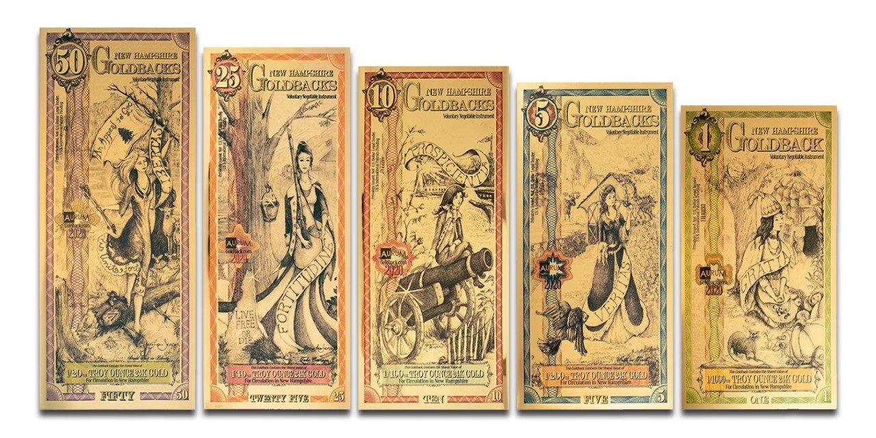 Goldbacks are a new form of currency that makes gold flexible and spendable. Each note varies in size and thickness and contains a fixed amount of 24K Gold. This bill series honors New Hampshire and is popular with the Free State Project.