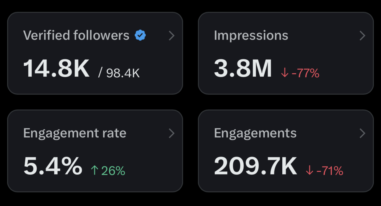 Our view counts plummeted over the last 2 months after the new algorithms took effect on X. And our “Impressions” and “Engagements” are similarly down, more than 70%!