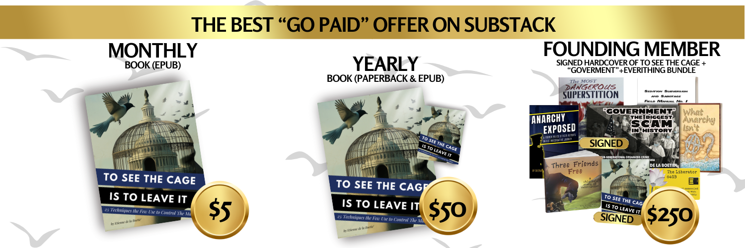 Go paid at the $5 a month level, and we will send you both the PDF and e-Pub versions of Etienne’s new book: To See the Cage Is to Leave It - 25 Techniques the Few Use to Control the Many and a coupon code for 10% off anything in the https://artofliberty.org/store/.